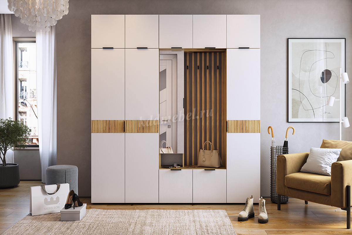 Стильные, трендовые рейки МДФ, акцентные крючки, зеркало, в котором можно себя увидеть в полный рост, полки для мелочей и головных уборов,