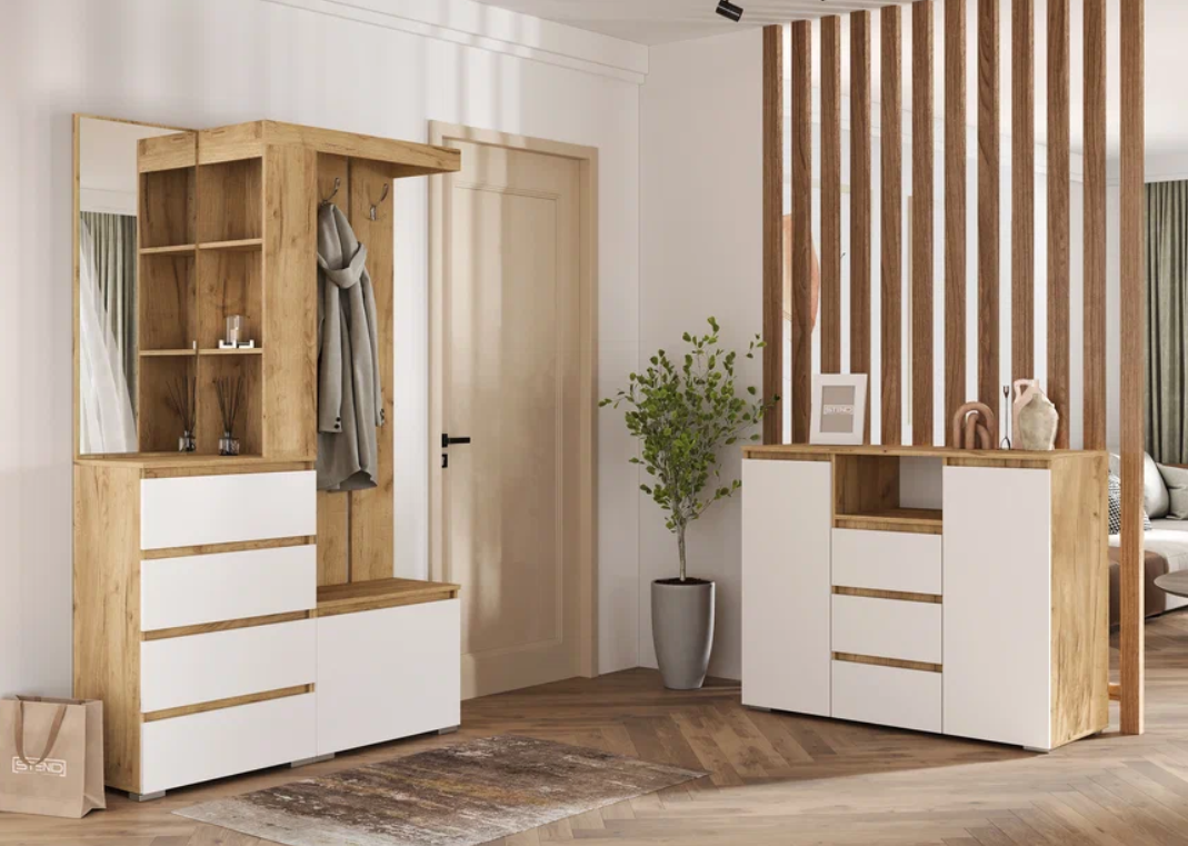 Прихожая Хелен — стильный и практичный модуль, в котором продумана каждая деталь. Рядом с зеркалом расположены полочки для косметики, парфюма и аксессуаров, а в ящиках есть место для шарфов, перчаток и ключей. Панель с крючками для верхней одежды дополнена обувницей. Плавный ход ящиков делает прихожую еще удобнее.