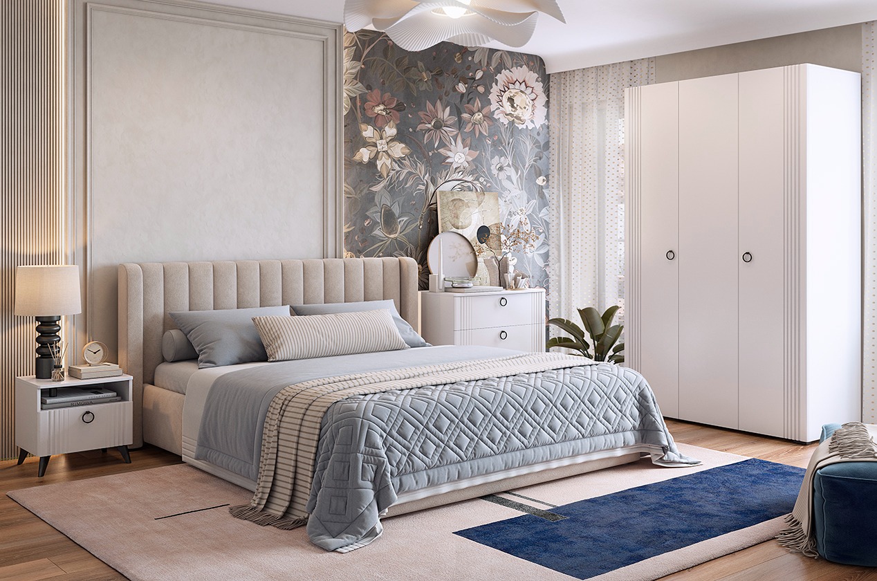 Спальный гарнитур "Ева" идеально сочетает в себе стиль и функциональность. Корпус выполнен из ЛДСП в белом деревянном цвете, а фасады - из МДФ, облицованного пленкой ПВХ белого матового цвета. Смело можно сказать, что спальный гарнитур выглядит элегантно.