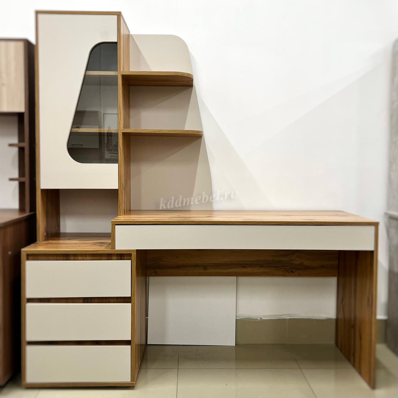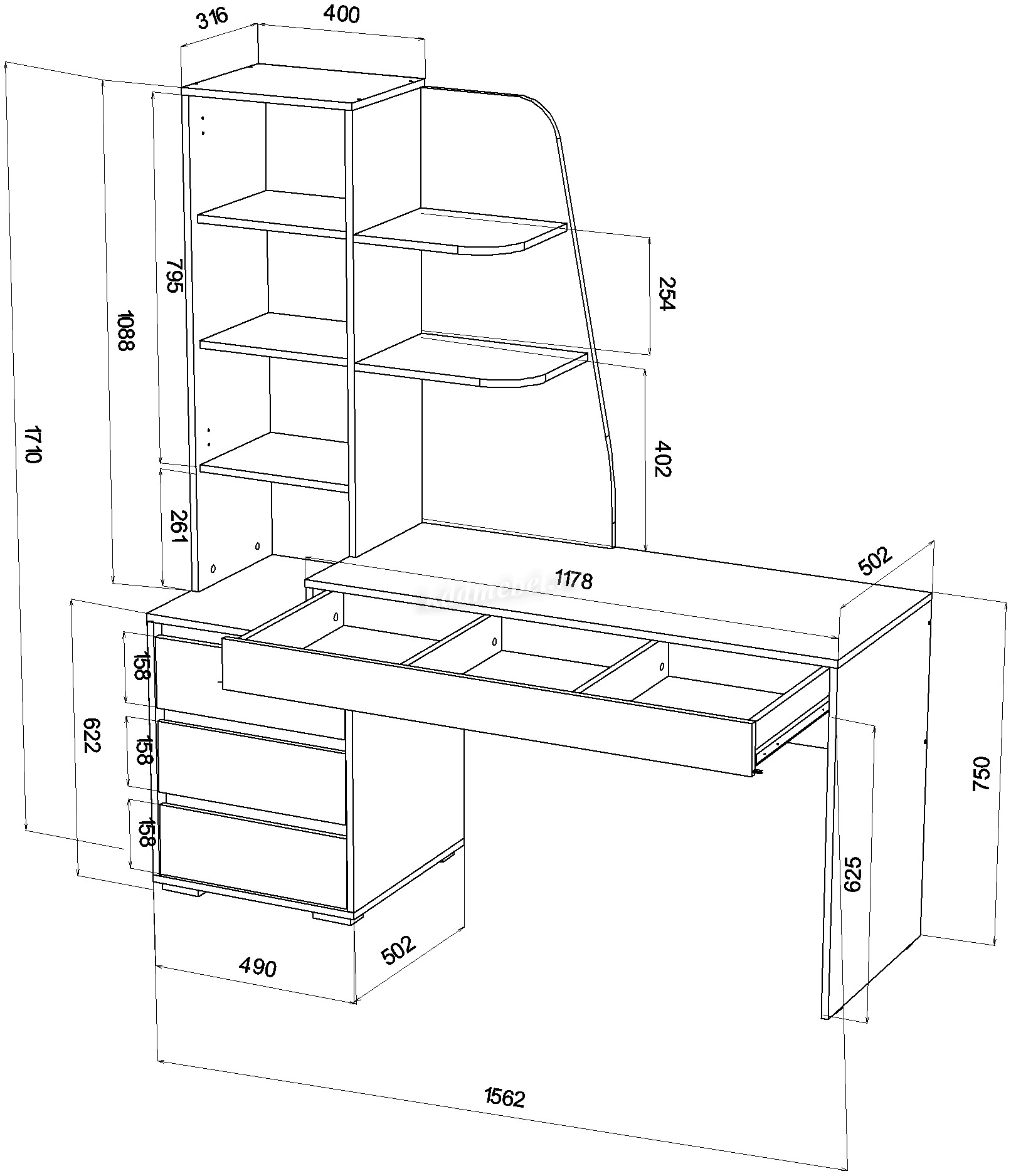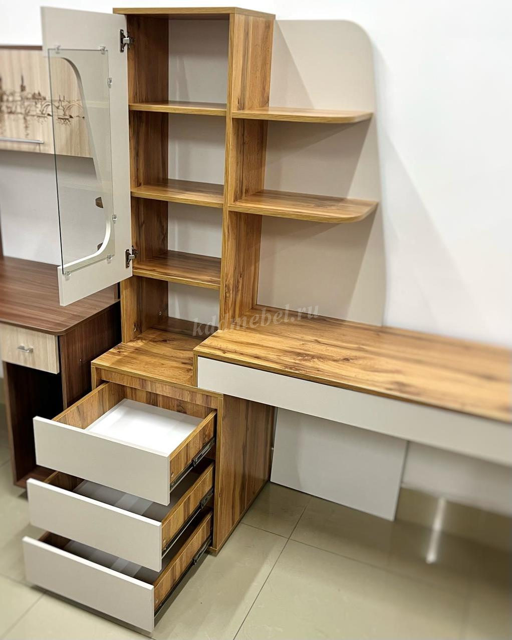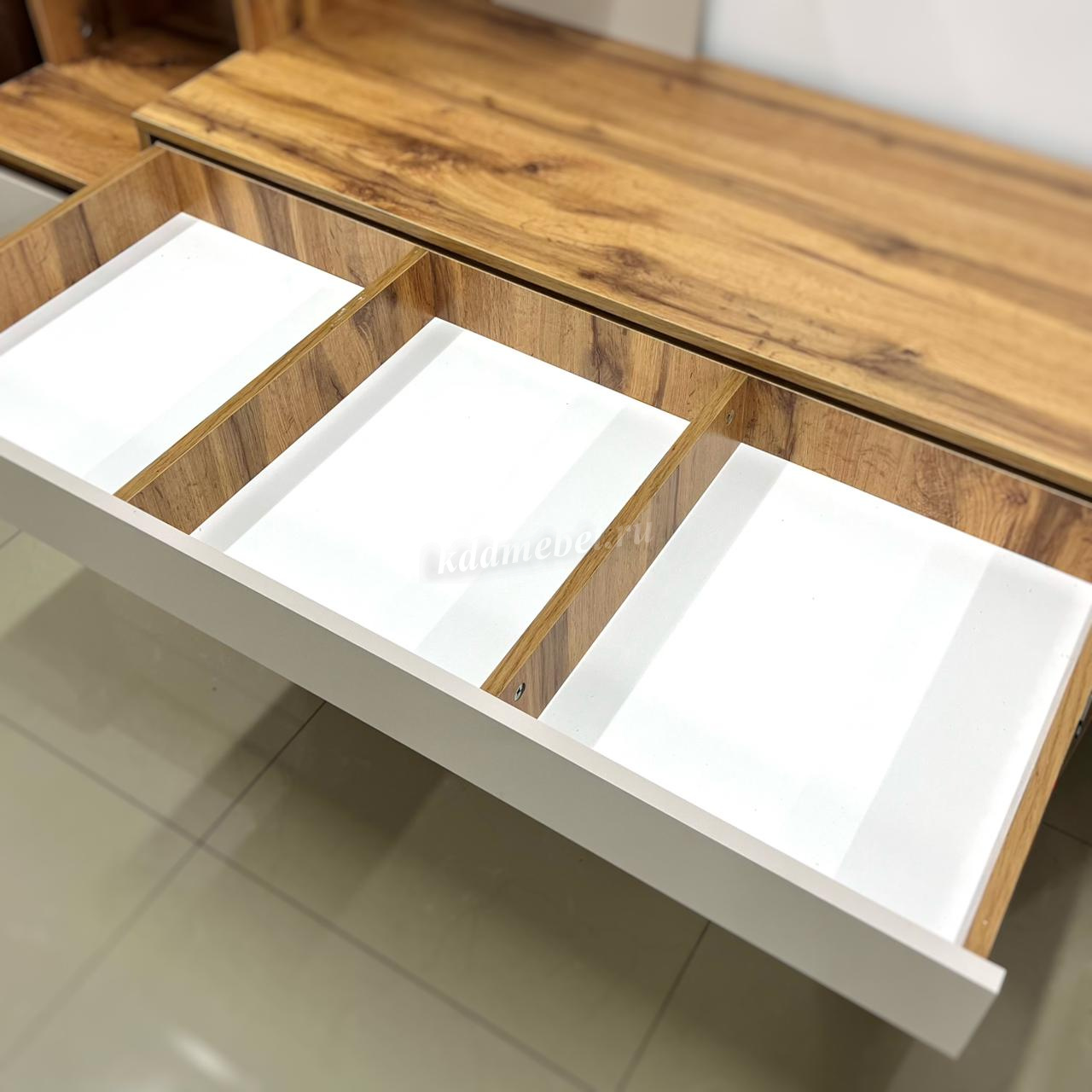 Три ящика в тумбе + Один широкий ящик под столешницей.